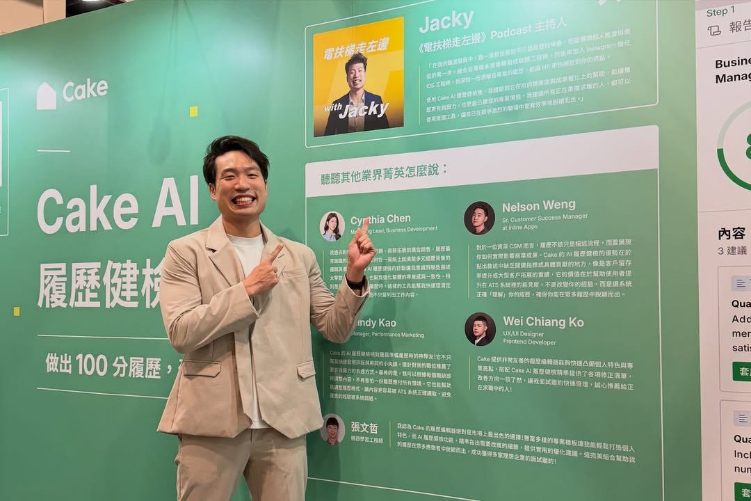 在Cake 的職涯博覽會上,我錄了一場現場版的 Live Podcast,還在會場讓 AI 幫我健檢履歷(履歷被放超大真的有點害羞)。