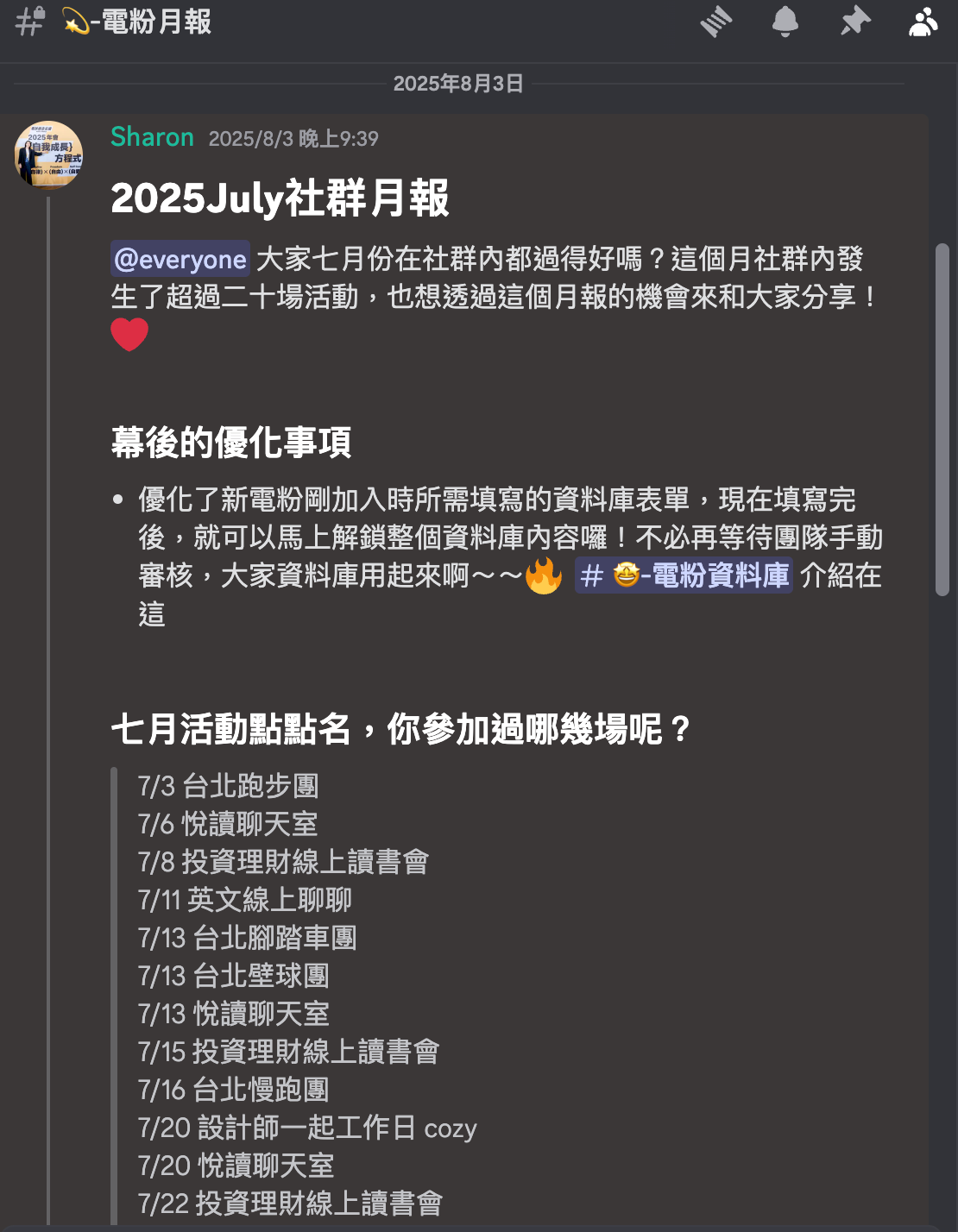 💡 每月月底總結上個月發生的有趣活動、團隊幕後進行的事項,提升電粉們對於社群的參與度與融入!