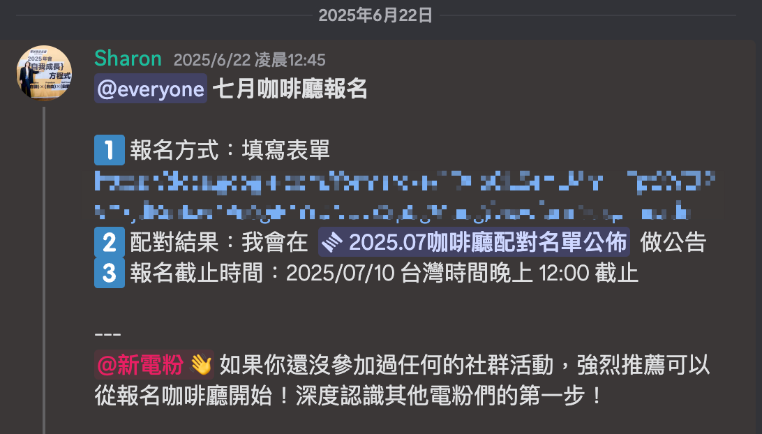 💡 社群內好評度最高的熱門長青活動!每位新電粉進入社群內,最快可以深入認識新的好朋友跟夥伴的機會,配對到的電粉可以私下約時間與地點(實體 or 線上),透過這樣的機會,一起交流自我成長、工作、興趣!